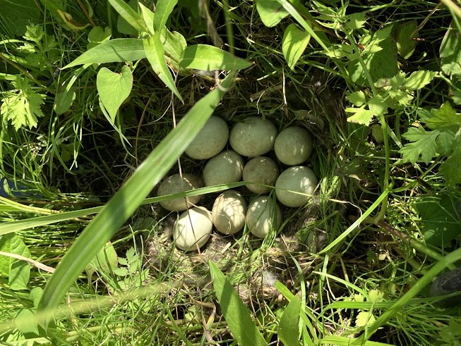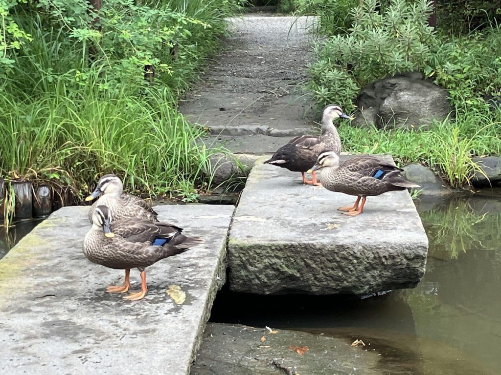 向島百花園では園内1/4ほど広がる池があります。そこでガマやススキ、ハスなどの植物を観察することができます。そんな池にはカルガモもやってきます。4月頃、私たちが作業している最中にカルガモの巣を発見しました。無事に孵り、小さな赤ちゃんカモの様子が見られるようになりました。今では大きく成長し親と見間違えるくらいになり、嬉しい限りです。このように都会の中でも懸命に生きる生き物たちを見ると自然環境を守ることへの意欲がより一層強まります。