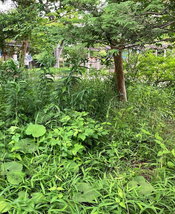 向島百花園での主な作業は除草です。しかし、ひとくくりに除草といっても作業する内容にいくつか違いがあります。人が歩く道や橋の際に生えている植物を見通しがわるくなってしまわないように刈り取ります。その際、すべての植物を刈り取ってしまうわけではありません。希少な植物があれば刈り取らず残します。また刈取りではまたすぐに生長してしまうような厄介な植物は根っこから引っこ抜くようにします。このような作業を通して私たちは庭園の風景や植物の状態に気を配り、景観と植生の保護に努めています。続いてそんな除草作業のひとつである選択除草についてお話します。