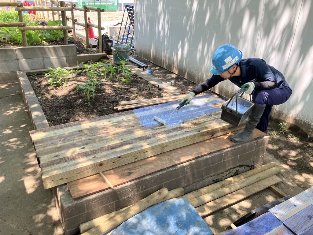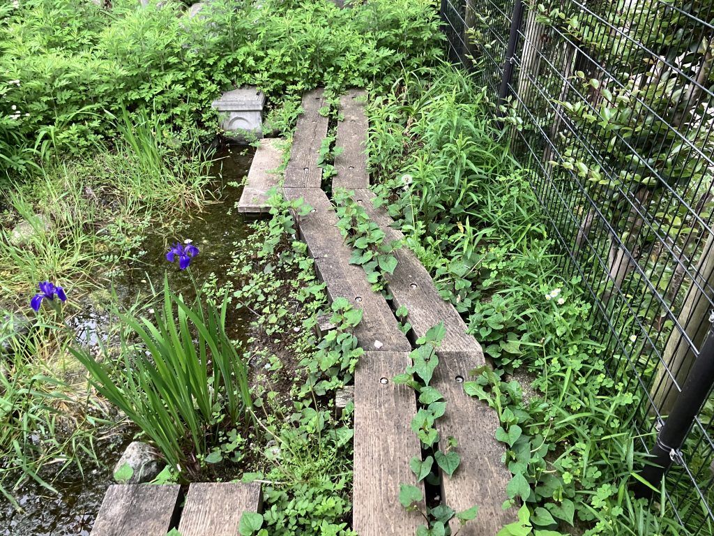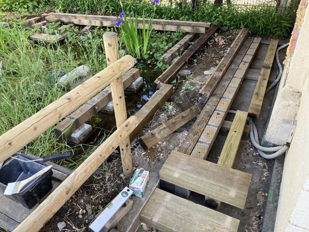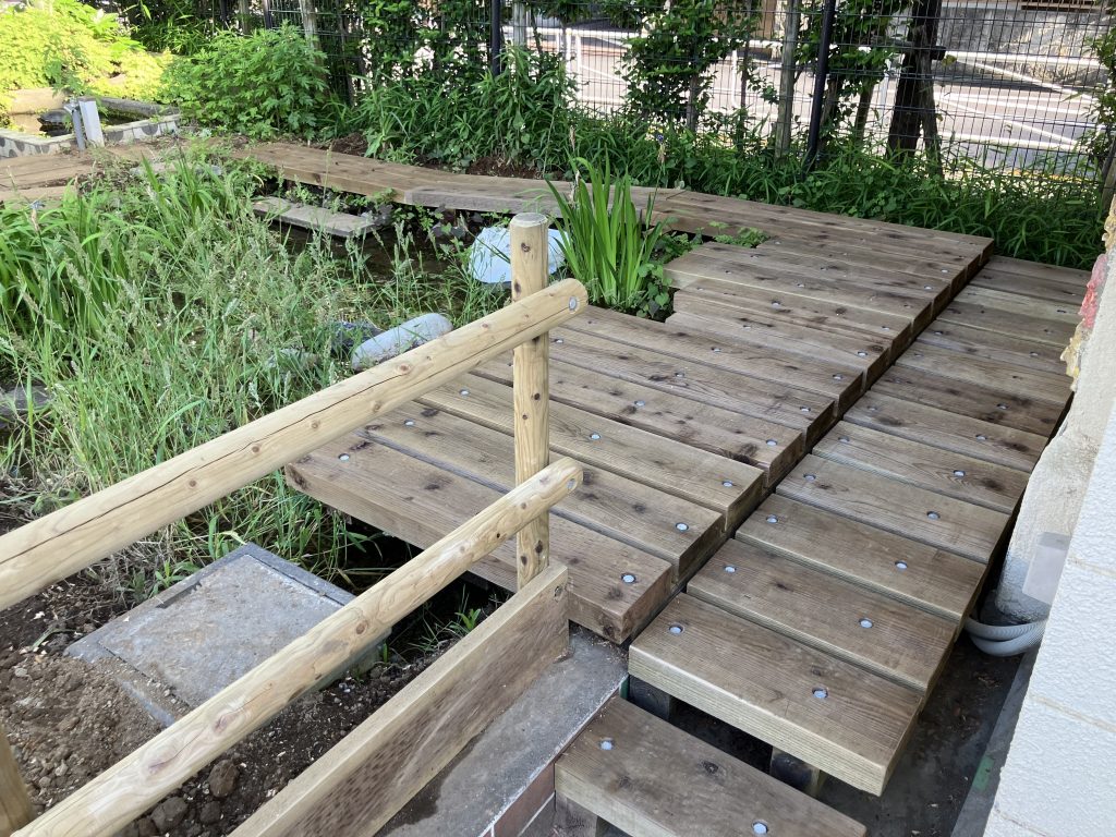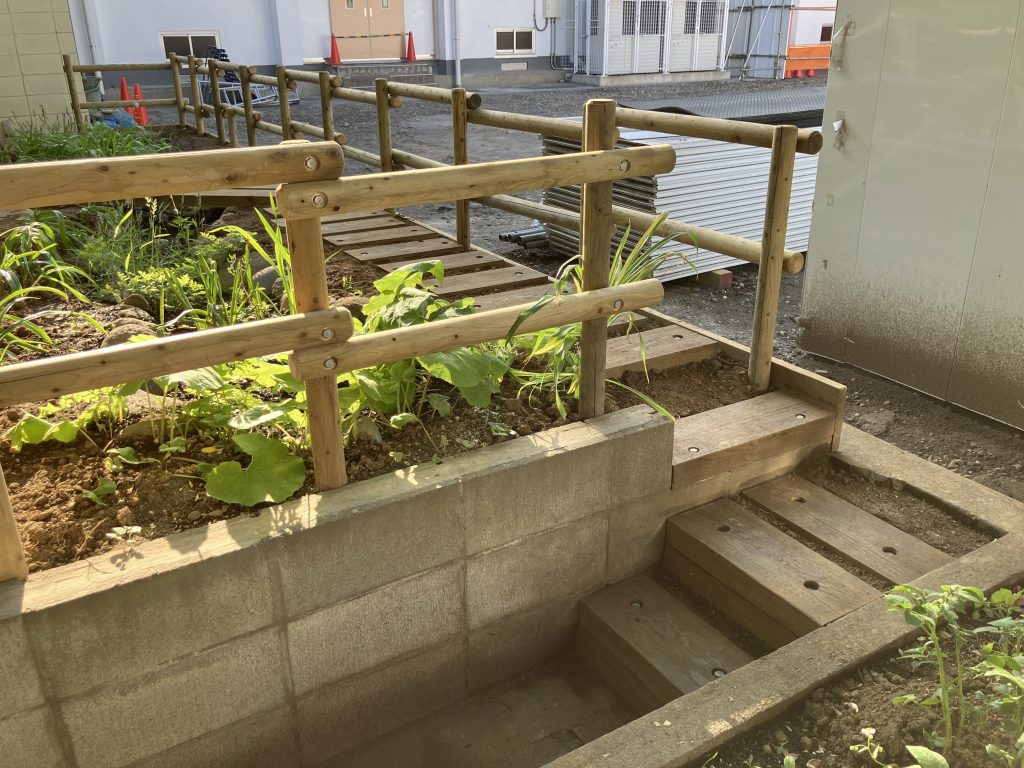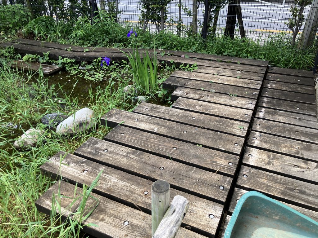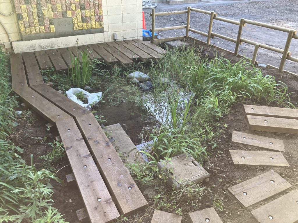 小学校改修工事に伴い、平成29年3月に当社で施工したビオトープの改修工事を実施しました。工事内容は、ビオトープ内の除草のほか、木道・柵・土留め・ポンプ等の修理です。木道(ウッドデッキ)の補修に際しては、生徒のみなさんが安全に、そして長くビオトープを活用できるよう、腐食しにくく耐久性の高い木材を選定しています。